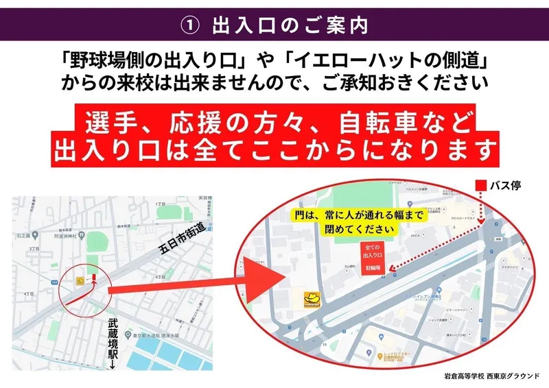 ・校門は正門(川越街道側)よりお入りください。他の門からの入校は禁止です。