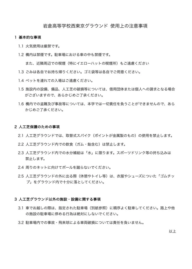 ・グラウンド前の土手は登らず、必ず歩道を通る。(過去に土手を登る選手がいた為、施設側より注意を受けています。)
