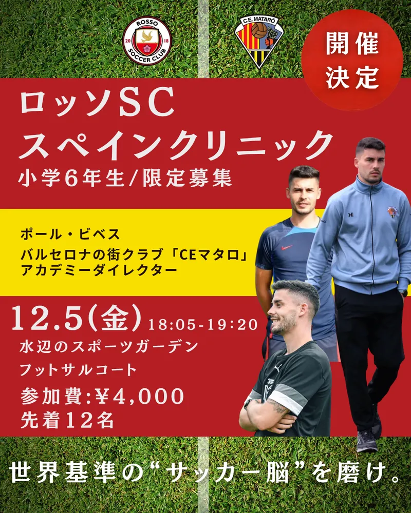 この度、ロッソSCではバルセロナ近郊の名門街クラブ「CEマタロ」より指導者を招きクリニックを開催することになりましたのでご案内いたします。