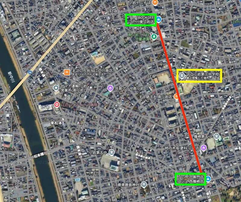 写真の赤線部分の柴又街道の「ブックオフ」から「ペットのコジマ」の区間は通らないようにしてください。